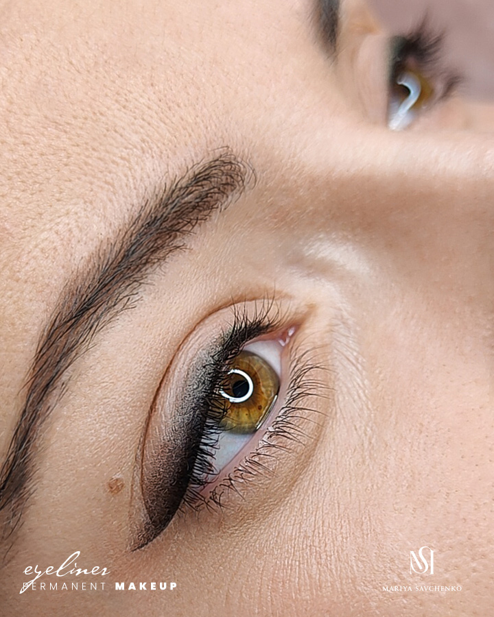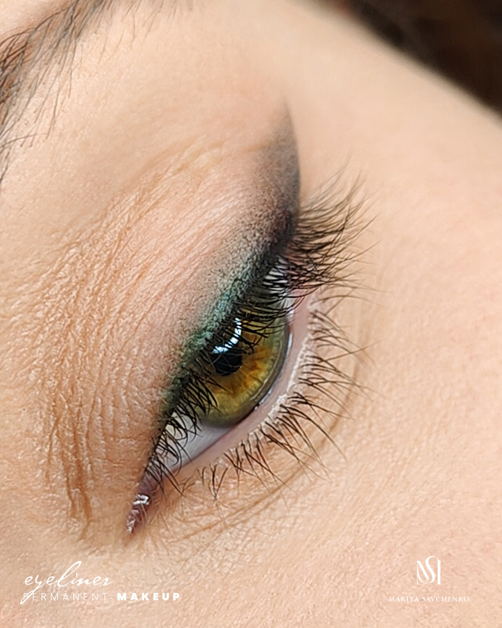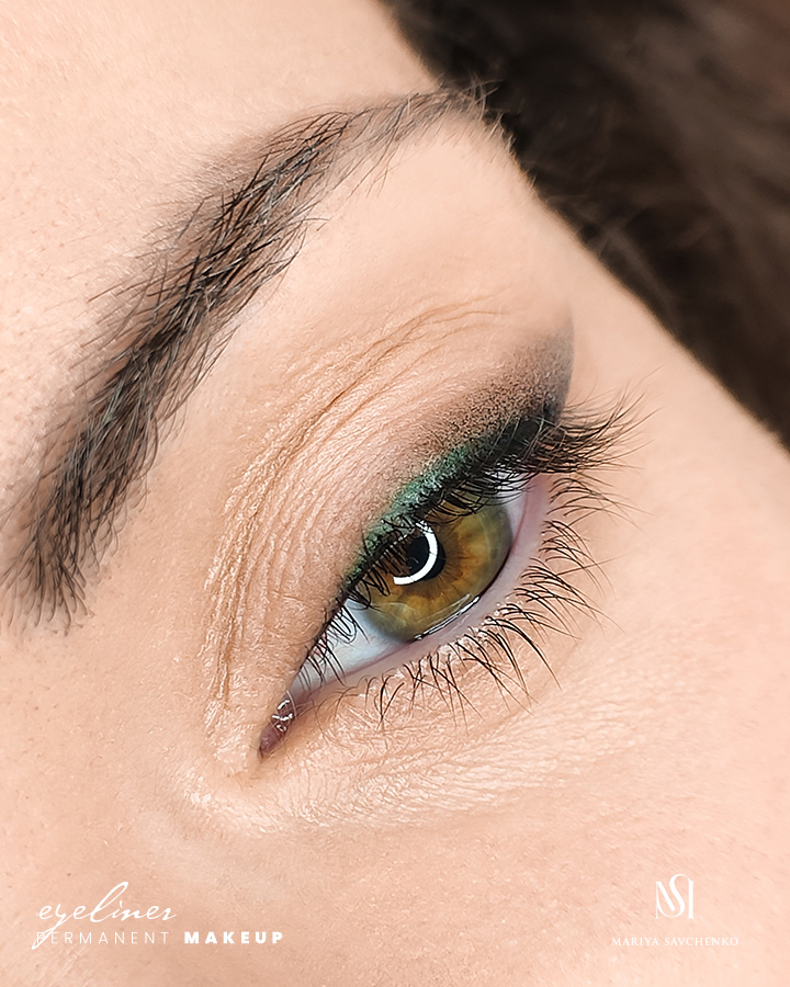 Eyeliner tatuato con sfumatura ombretto, realizzato in due coloriTi mostro un eyeliner dalla sfumatura di media grandezza, realizzato in due colori, nero e verde oliva. Il verde, in accordo con il colore degli occhi, aggiunge luminosità ad un makeup permanente di grande eleganza.